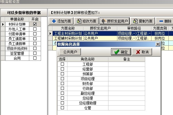 在多級審核中,可以設置多套審核方案,每套方案可設置多個崗位,可設置方案的授權發(fā)起用戶(在業(yè)務單據(jù)中選擇該審核方案的用戶)。在添加方案時,有三種方式逐級審核、平級審核、跨級審核。逐級審核是指各個崗位按先后順序依次審核該業(yè)務單據(jù),例如審核順序為,工程部、預算部、經(jīng)營部、總經(jīng)理如下圖: