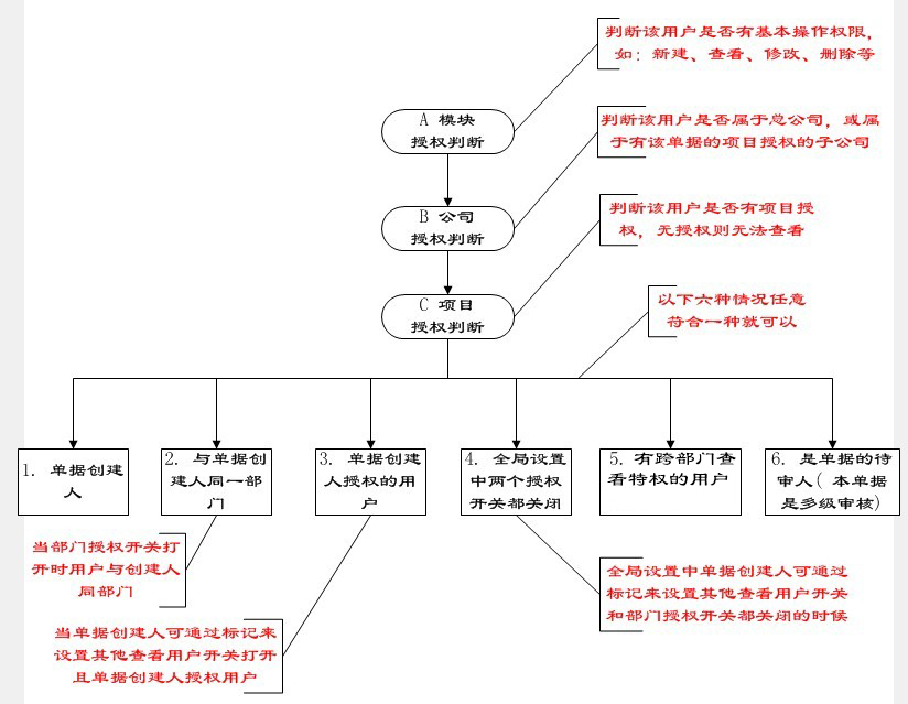 當A、B、C三個模塊全部獲得授權后,再來判斷以下六種,以下情況符合任意一種,用戶就可查看相關的業(yè)務單據。