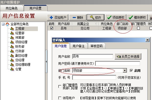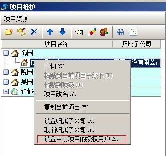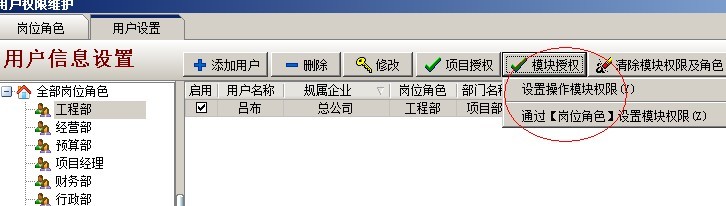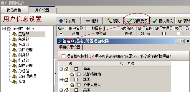 C:項目授權判斷,是指判斷該用戶是否有項目授權,在系統(tǒng)維護模塊中【用戶管理權限設置】和項目維護中都可以進行設置用戶項目授權。設置方法如下圖: