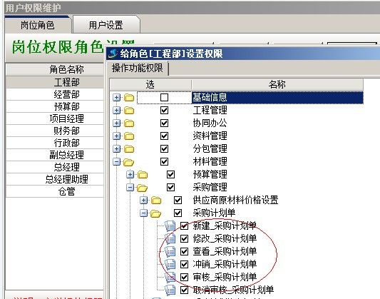 A:模塊授權判斷,是指用戶針對相關業(yè)務單據所擁有的基礎操作授權,如:業(yè)務單據的新建、修改、刪除、查看等。是在系統(tǒng)維護模塊中【用戶管理權限設置】進行設置,只要給先做好【崗位角色】授權,然后給用戶選擇相應崗位即可。如下圖: