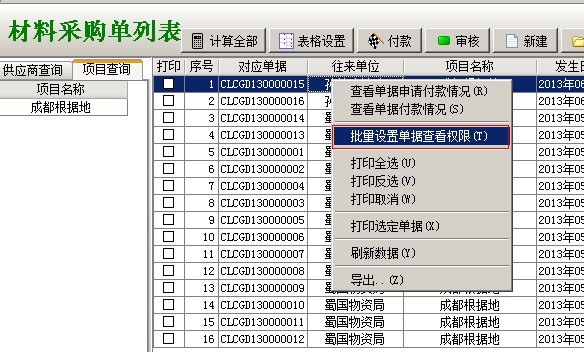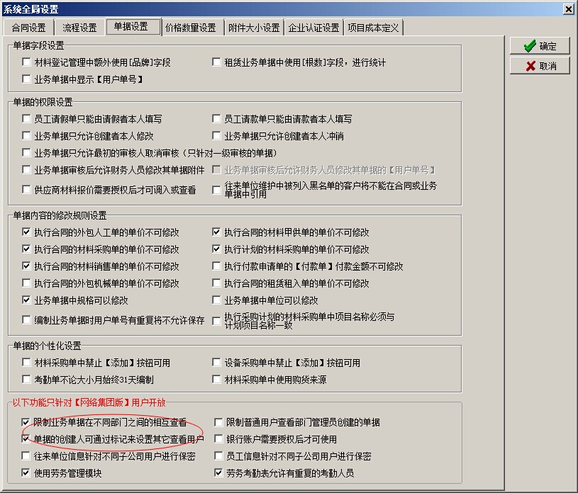 在工程項目管理軟件(集團版)中,存在一些設置(開關),使業(yè)務單據的訪問存在一定限制,只有在滿足條件的。用戶才能查看到該業(yè)務單據。如下圖: