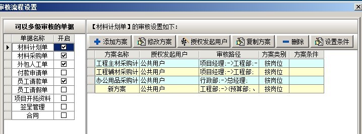 6. 業(yè)務單據是多級審核,審核流程中的待審核用戶不受限制。審核流程設置是在系統(tǒng)維護模塊,【審核流程設置】中進行設置。如下圖:左側是單據名稱列表,右側是單據審核的各種方案。