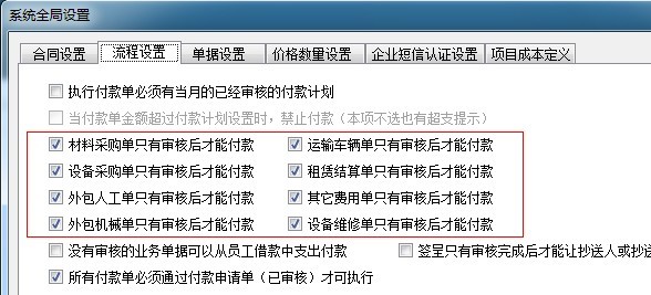 公司規(guī)定:只有審核后的單據(jù)才能提起付款申請,所以超級用戶已經(jīng)在【全局設(shè)置】中開啟了以下八個(gè)開關(guān):