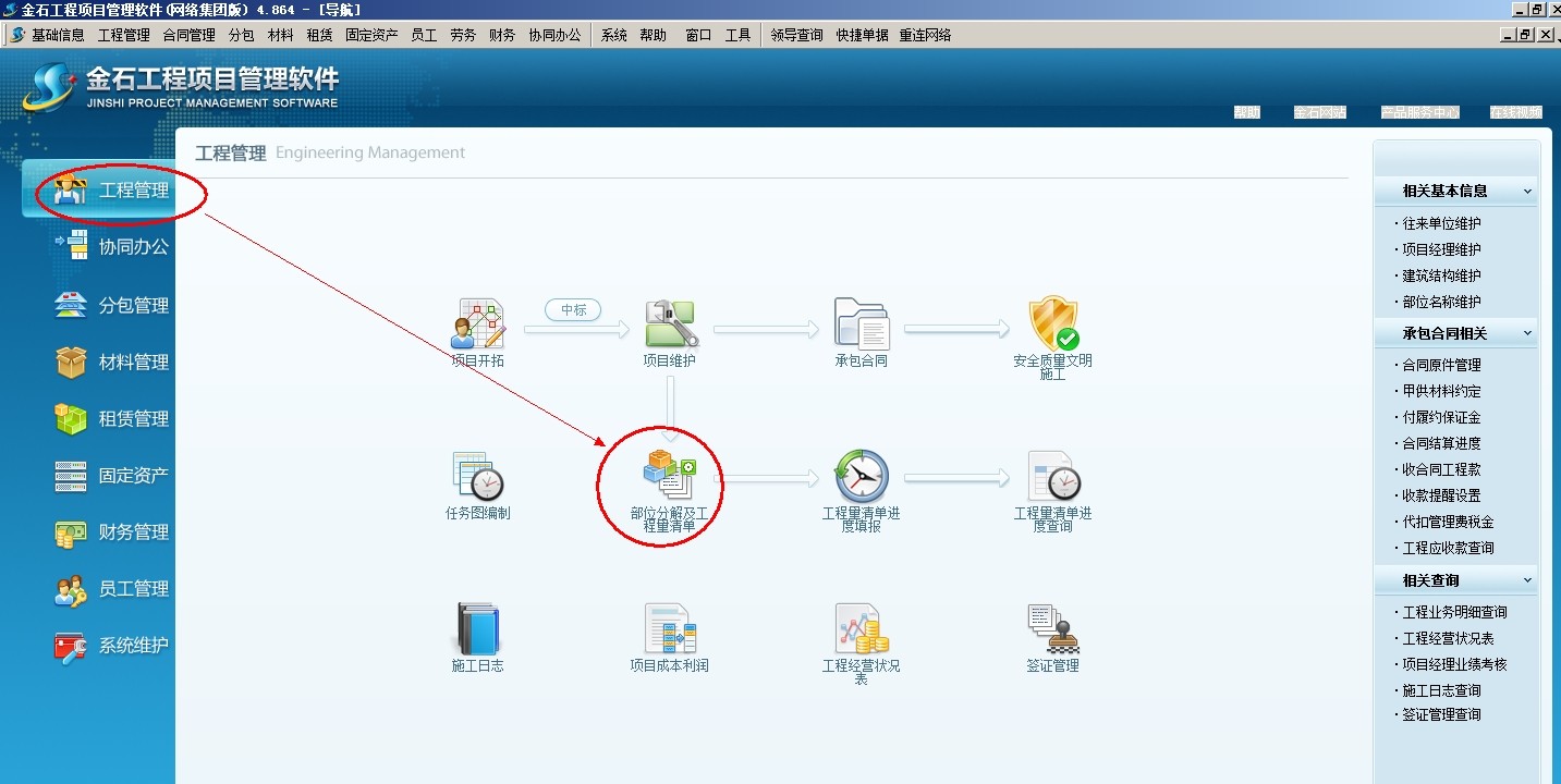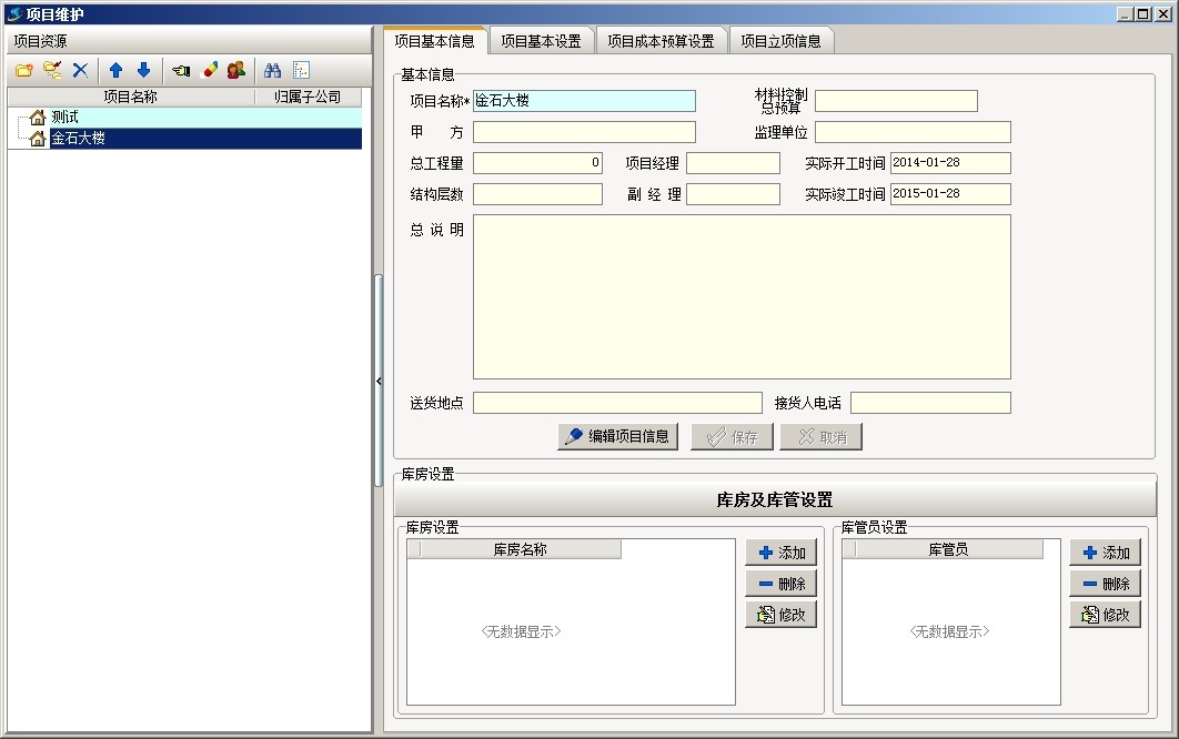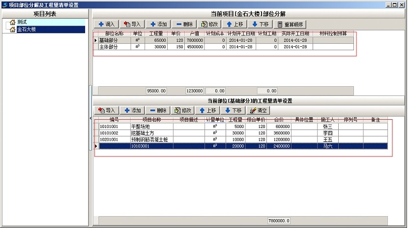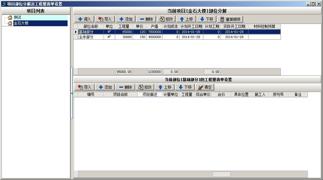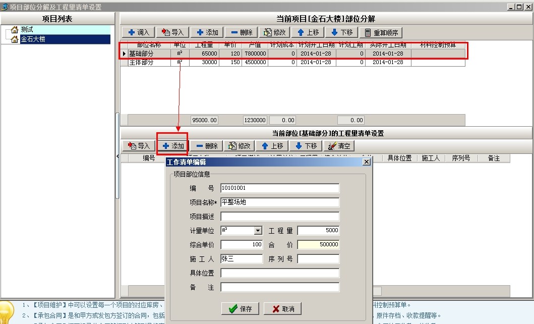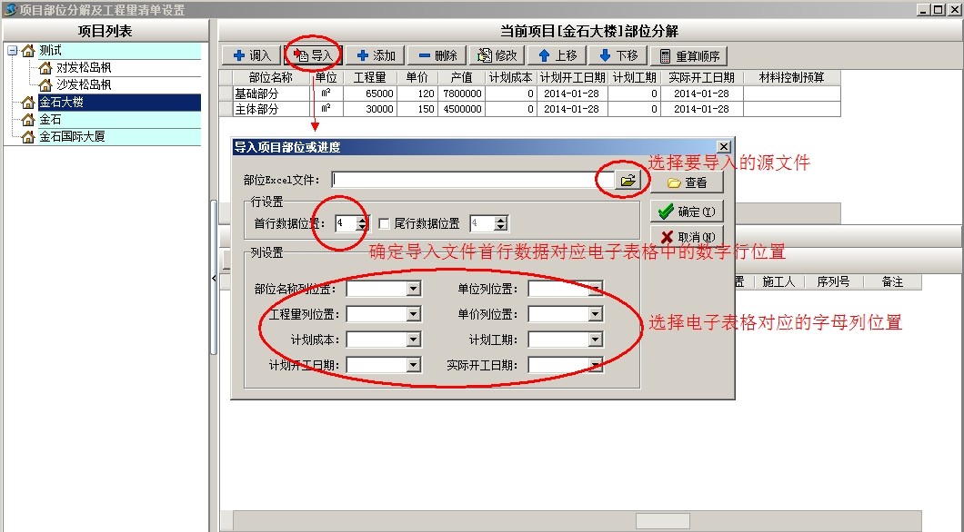 上圖是工地常用部位劃分的部分清單內(nèi)容,下面以上面截圖為例說明軟件中工程的部位劃分,首先新建項目金石大樓