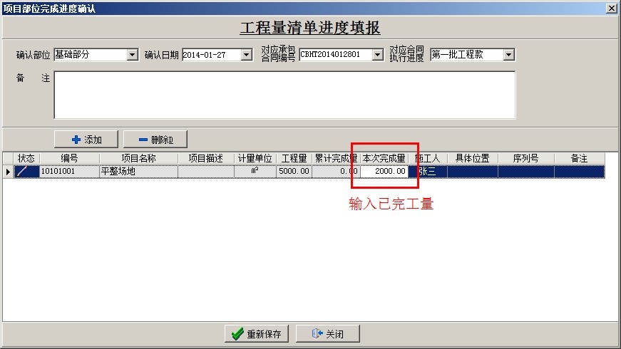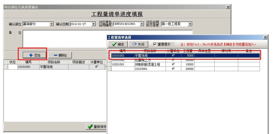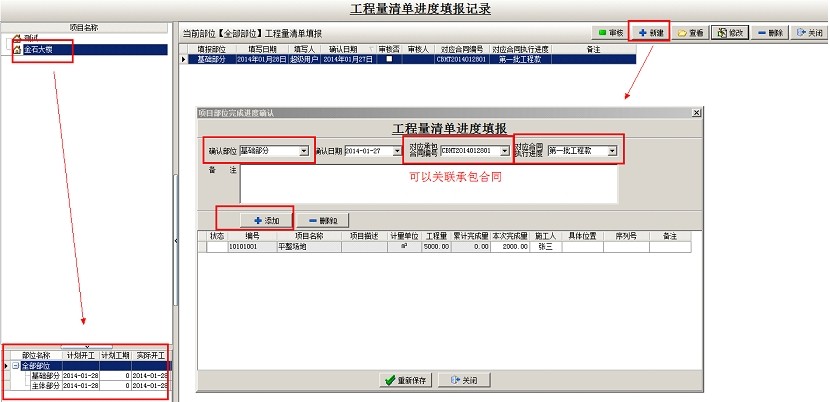 選中相應(yīng)的項目,點擊新建,填出工程量進度填報窗口,選擇部位名稱,可以選擇關(guān)聯(lián)項目對應(yīng)的承包合同號和承包合同執(zhí)行進度,然后點添加,調(diào)入清單內(nèi)容,在本次完成量處輸入已完成的工作量,不限制錄入進度填報,直至清單工作量完成,調(diào)入下一項清單內(nèi)容(如某項清單實際工程量超過清單預(yù)算量,可以繼續(xù)填報)