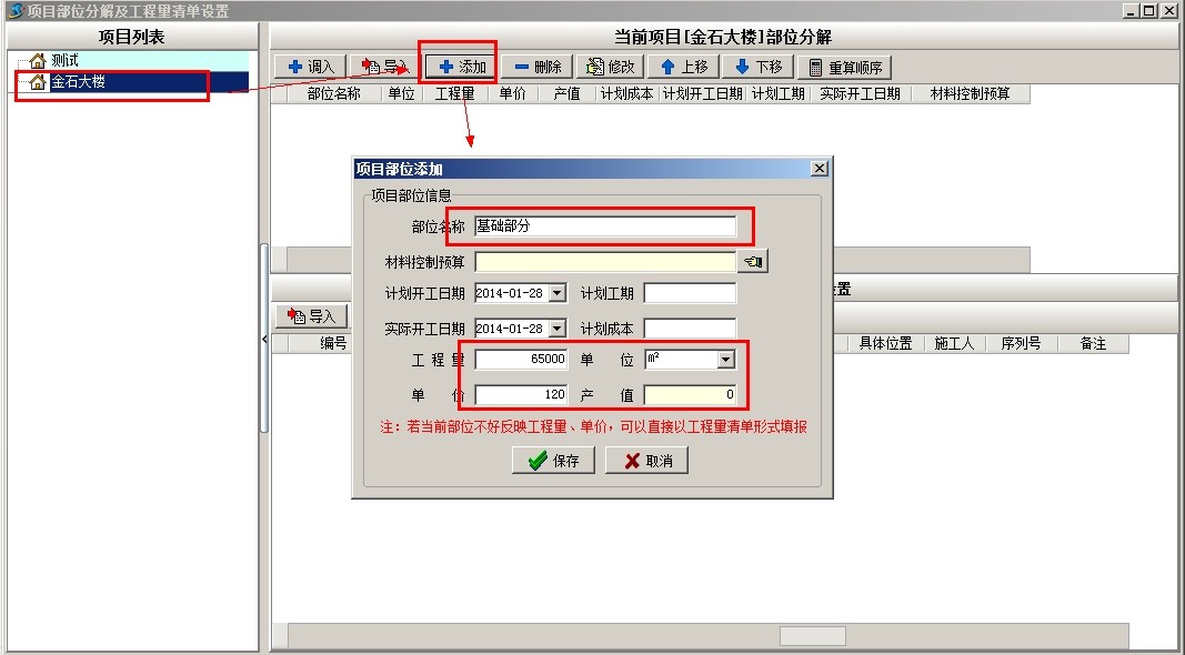 選中項目,點當(dāng)前項目部位分解的添加,彈出添加窗口,填寫部位名稱、工程量、單位等相關(guān)信息,多個部位需要多次添加。也可以使用簡單方法,做好EXCEL電子表格,導(dǎo)入