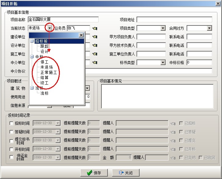 (1)需要再回到【項(xiàng)目開拓】中修改項(xiàng)目開拓的狀態(tài)為中標(biāo)的狀態(tài)(中標(biāo)下的五個(gè)狀態(tài)任選一項(xiàng)),然后保存