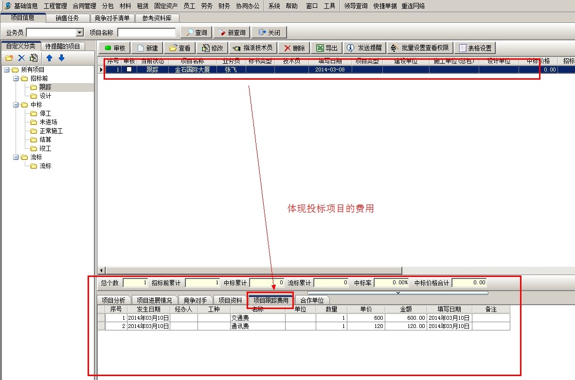以公司的“市場部”或“銷售部”來進(jìn)行前期費(fèi)用的承擔(dān)。如果項(xiàng)目沒有中標(biāo),則前期跟蹤費(fèi)用自然歸屬到該部門下,如果中標(biāo)通過在【項(xiàng)目維護(hù)】中新建項(xiàng)目,從項(xiàng)目開拓中引入,并確認(rèn)結(jié)轉(zhuǎn)費(fèi)用即可。