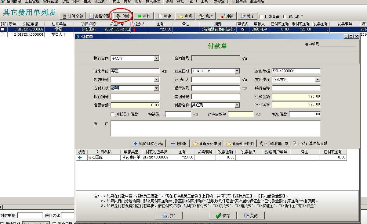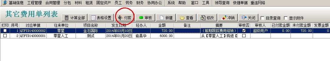 選中單據(jù)點(diǎn)擊付款,選擇支付方式,點(diǎn)保存。項(xiàng)目開拓中可以查看到該投標(biāo)項(xiàng)目發(fā)生的費(fèi)用