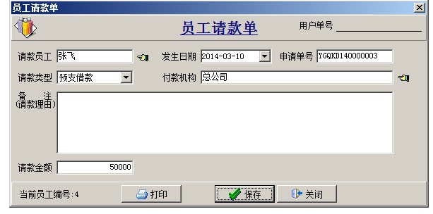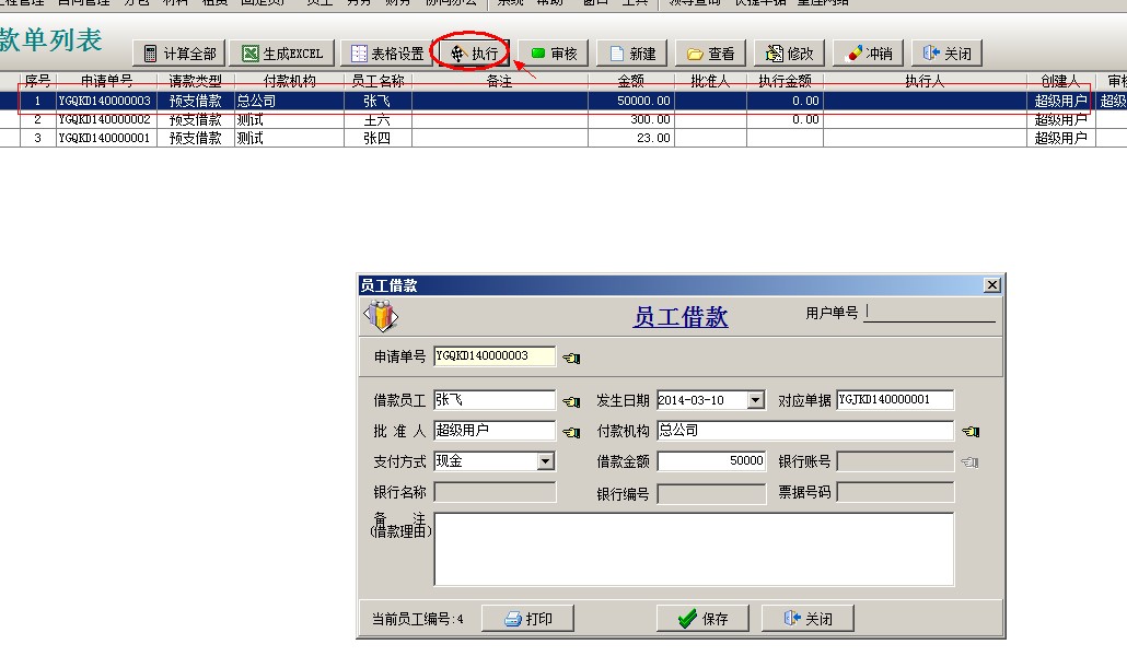 員工請(qǐng)款單可以開(kāi)啟使用多級(jí)審核,審核之后執(zhí)行付款,生成員工借款單,保存