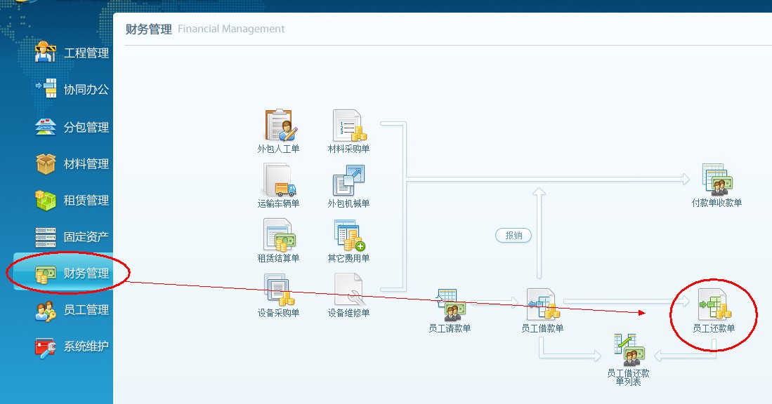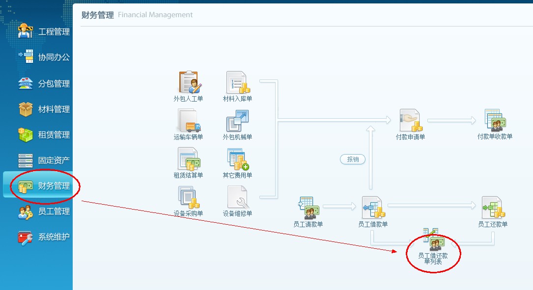 4、下面查詢一下業(yè)務(wù)員借款,點(diǎn)擊財(cái)務(wù)管理,打開(kāi)員工借還款單列表