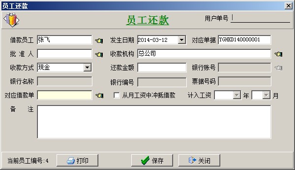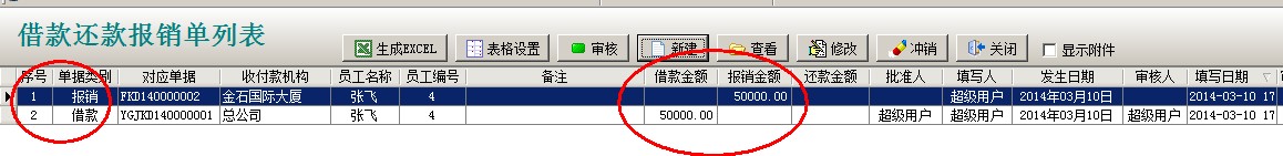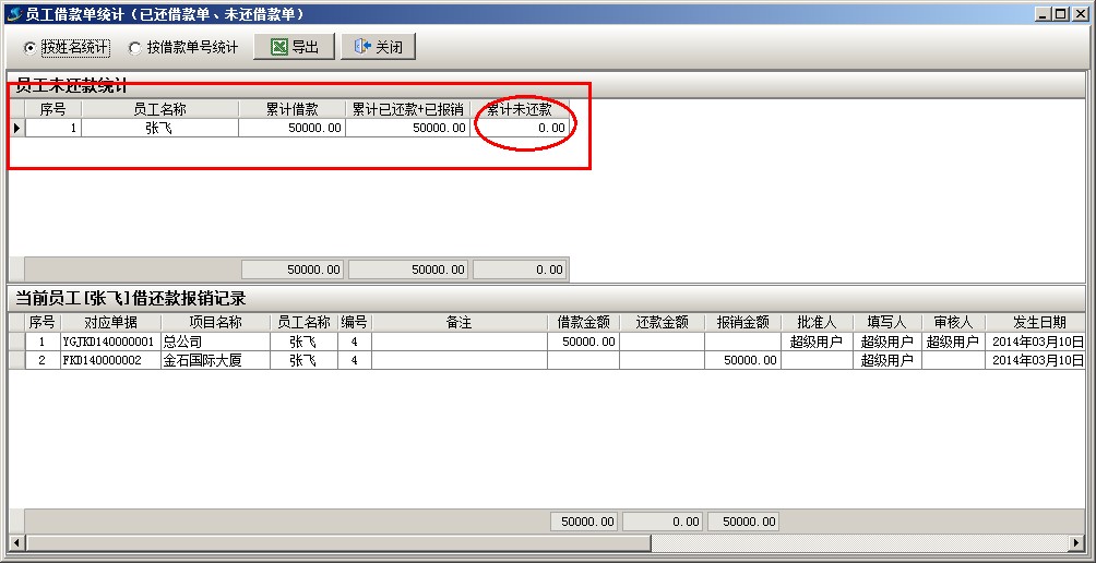 借還款單列表中2個(gè)單據(jù),一個(gè)是業(yè)務(wù)員(張飛)的借款,另一個(gè)報(bào)銷還款單據(jù),兩個(gè)單據(jù)抵消,業(yè)務(wù)員(張飛)就沒(méi)有欠款。還可以通過(guò)員工借款單統(tǒng)計(jì)查詢,財(cái)務(wù)管理模塊------相關(guān)查詢-----員工借款單統(tǒng)計(jì)。