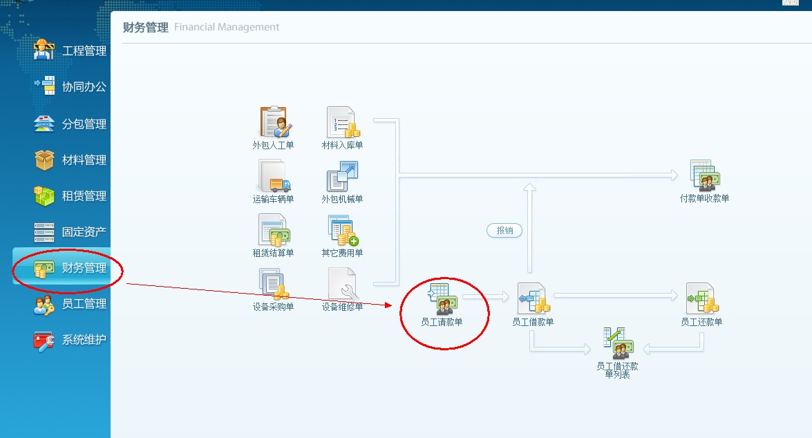 先做員工請(qǐng)款單(借款單的控制單據(jù)),打開(kāi)財(cái)務(wù)管理模塊,員工請(qǐng)款單