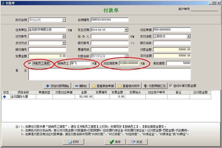 (3)最后做付款單沖抵員工借款,把當(dāng)時(shí)交納的保證金報(bào)銷出來(lái)。
