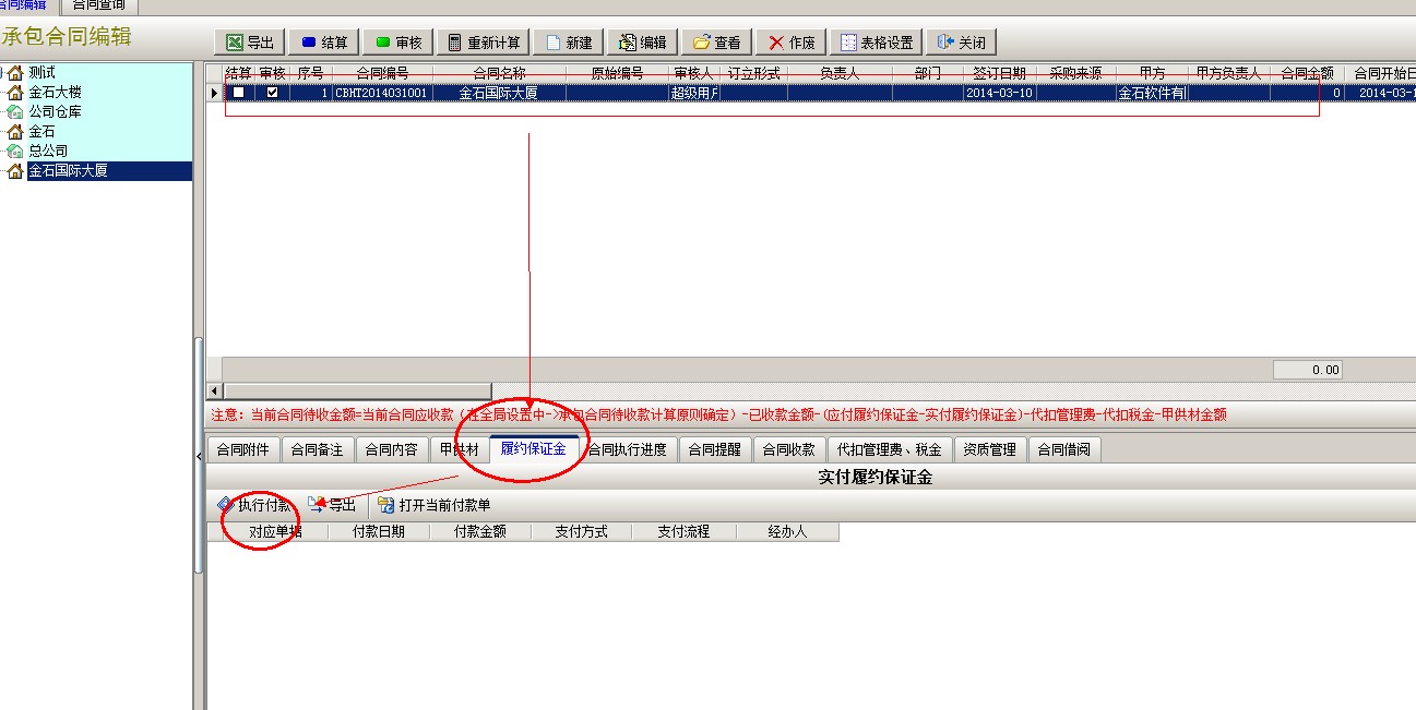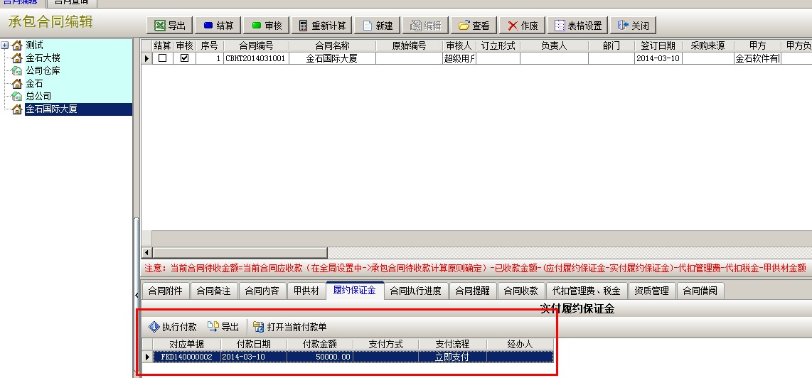 選中新建的合同,點(diǎn)擊下面執(zhí)行功能中的履約保證金,點(diǎn)執(zhí)行付款,彈出付款單
