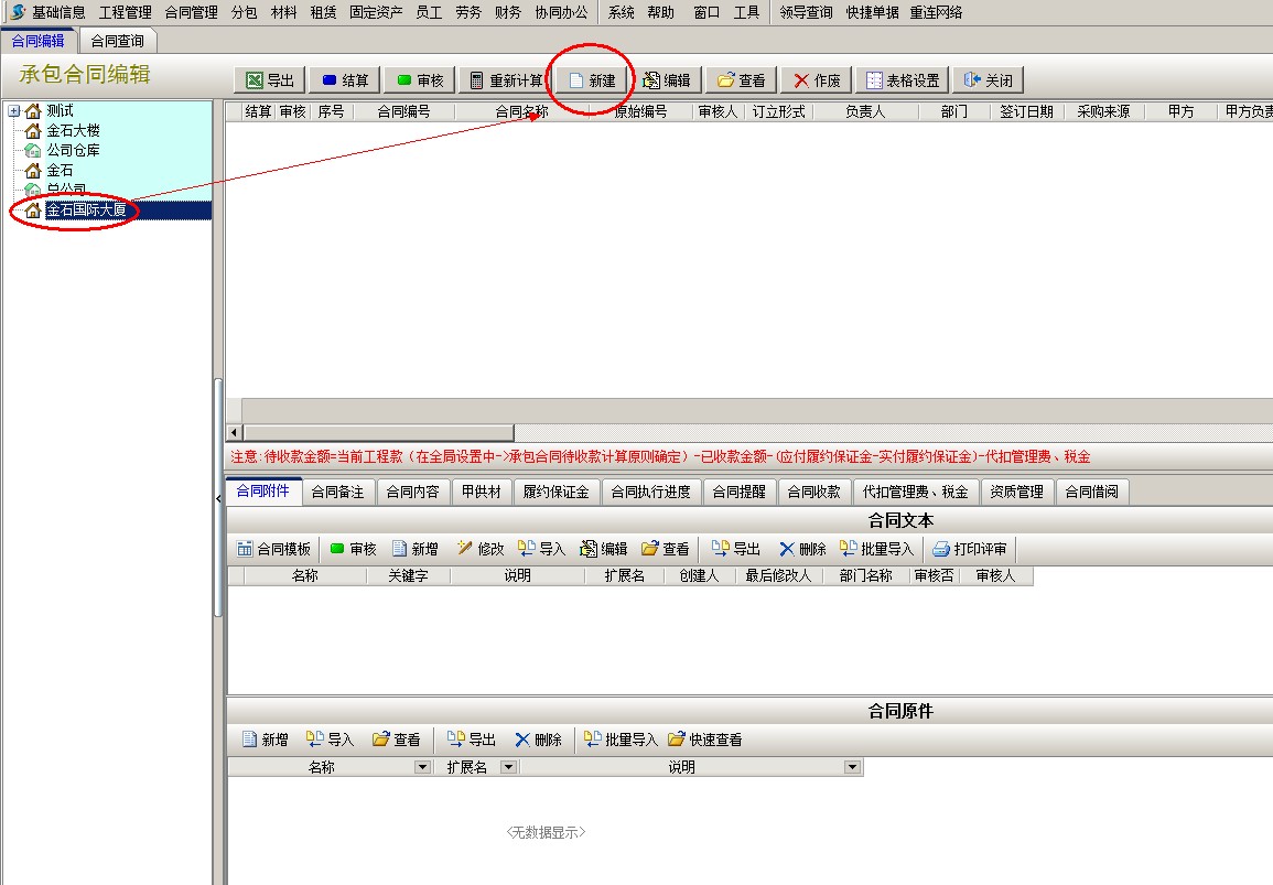 左邊選中新建的項(xiàng)目名稱金石國(guó)際大廈,右邊點(diǎn)擊新建,彈出新建承包合同窗口,錄入合同基本信息,填寫(xiě)合同履約保證金金額,然后保存。